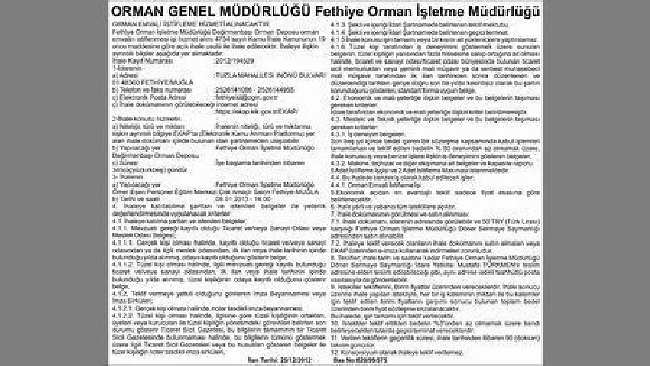 ORMAN EMVALİ İSTİFLEME HİZMETİ ALINACAKTIR Fethiye Orman İşletme Müdürlüğü Değirmenbaşı Orman Deposu orman emvalin istiflenmesi işi hizmet alımı 4734 sayılı Kamu İhale Kanununun 19 uncu maddesine göre açık ihale usulü ile ihale edilecektir. İhaleye ilişkin ayrıntılı bilgiler aşağıda yer almaktadır: İhale Kayıt Numarası : 2012/194529 1-İdarenin a) Adresi : TUZLA MAHALLESI INÖNÜ BULVARI 01 48300 FETHİYE/MUĞLA b) Telefon ve faks numarası : 2526141086 - 2526144955 c) Elektronik Posta Adresi : [email protected] ç) İhale dokümanının görülebileceği internet adresi : https://ekap.kik.gov.tr/EKAP/ 2-İhale konusu hizmetin a) Niteliği, türü ve miktarı : İhalenin niteliği, türü ve miktarına ilişkin ayrıntılı bilgiye EKAP’ta (Elektronik Kamu Alımları Platformu) yer alan ihale dokümanı içinde bulunan idari şartnameden ulaşılabilir. b) Yapılacağı yer : Fethiye Orman İşletme Müdürlüğü Değirmenbaşı Orman Deposu c) Süresi : İşe başlama tarihinden itibaren 345(üçyüzkırkbeş) gündür 3- İhalenin a) Yapılacağı yer : Fethiye Orman İşletme Müdürlüğü Ömer Eşen Personel Eğitim Merkezi Çok Amaçlı Salon Fethiye-MUĞLA b) Tarihi ve saati : 08.01.2013 - 14:00 4. İhaleye katılabilme şartları ve istenilen belgeler ile yeterlik değerlendirmesinde uygulanacak kriterler: 4.1. İhaleye katılma şartları ve istenilen belgeler: 4.1.1. Mevzuatı gereği kayıtlı olduğu Ticaret ve/veya Sanayi Odası veya Meslek Odası Belgesi; 4.1.1.1. Gerçek kişi olması halinde, kayıtlı olduğu ticaret ve/veya sanayi odasından ya da ilgili meslek odasından, ilk ilan veya ihale tarihinin içinde bulunduğu yılda alınmış, odaya kayıtlı olduğunu gösterir belge, 4.1.1.2. Tüzel kişi olması halinde, ilgili mevzuatı gereği kayıtlı bulunduğu ticaret ve/veya sanayi odasından, ilk ilan veya ihale tarihinin içinde bulunduğu yılda alınmış, tüzel kişiliğinin odaya kayıtlı olduğunu gösterir belge, 4.1.2. Teklif vermeye yetkili olduğunu gösteren İmza Beyannamesi veya İmza Sirküleri; 4.1.2.1. Gerçek kişi olması halinde, noter tasdikli imza beyannamesi, 4.1.2.2. Tüzel kişi olması halinde, ilgisine göre tüzel kişiliğinin ortakları, üyeleri veya kurucuları ile tüzel kişiliğin yönetimdeki görevlileri belirten son durumu gösterir Ticaret Sicil Gazetesi, bu bilgilerin tamamının bir Ticaret Sicil Gazetesinde bulunmaması halinde, bu bilgilerin tümünü göstermek üzere ilgili Ticaret Sicil Gazeteleri veya bu hususları gösteren belgeler ile tüzel kişiliğin noter tasdikli imza sirküleri, 4.1.3. Şekli ve içeriği İdari Şartnamede belirlenen teklif mektubu. 4.1.4. Şekli ve içeriği İdari Şartnamede belirlenen geçici teminat. 4.1.5 İhale konusu işin tamamı veya bir kısmı alt yüklenicilere yaptırılamaz. 4.1.6 Tüzel kişi tarafından iş deneyimini göstermek üzere sunulan belgenin, tüzel kişiliğin yarısından fazla hissesine sahip ortağına ait olması halinde, ticaret ve sanayi odası/ticaret odası bünyesinde bulunan ticaret sicil memurlukları veya yeminli mali müşavir ya da serbest muhasebeci mali müşavir tarafından ilk ilan tarihinden sonra düzenlenen ve düzenlendiği tarihten geriye doğru son bir yıldır kesintisiz olarak bu şartın korunduğunu gösteren, standart forma uygun belge, 4.2. Ekonomik ve mali yeterliğe ilişkin belgeler ve bu belgelerin taşıması gereken kriterler: İdare tarafından ekonomik ve mali yeterliğe ilişkin kriter belirtilmemiştir. 4.3. Mesleki ve Teknik yeterliğe ilişkin belgeler ve bu belgelerin taşıması gereken kriterler: 4.3.1. İş deneyim belgeleri: Son beş yıl içinde bedel içeren bir sözleşme kapsamında kabul işlemleri tamamlanan ve teklif edilen bedelin % 50 oranından az olmamak üzere, ihale konusu iş veya benzer işlere ilişkin iş deneyimini gösteren belgeler, 4.3.2. Makine, teçhizat ve diğer ekipmana ait belgeler ve kapasite raporu: 5 Adet İstifleme İşçisi ve 2 Adet İstifleme Makınası istenmektedir. 4.4. Bu ihalede benzer iş olarak kabul edilecek işler: 4.4.1. Orman Emvali İstifleme İşi 5.Ekonomik açıdan en avantajlı teklif sadece fiyat esasına göre belirlenecektir. 6. İhale yerli ve yabancı tüm isteklilere açıktır. 7. İhale dokümanının görülmesi ve satın alınması: 7.1. İhale dokümanı, idarenin adresinde görülebilir ve 50 TRY (Türk Lirası) karşılığı Fethiye Orman İşletme Müdürlüğü Döner Sermaye Saymanlığı adresinden satın alınabilir. 7.2. İhaleye teklif verecek olanların ihale dokümanını satın almaları veya EKAP üzerinden e-imza kullanarak indirmeleri zorunludur. 8. Teklifler, ihale tarih ve saatine kadar Fethiye Orman İşletme Müdürlüğü Döner Sermaye Saymanlığı İdare Yetkilisi Mustafa TÜRKMEN'e teslim adresine elden teslim edilebileceği gibi, aynı adrese iadeli taahhütlü posta vasıtasıyla da gönderilebilir. 9. İstekliler tekliflerini, Birim fiyatlar üzerinden vereceklerdir. İhale sonucu üzerine ihale yapılan istekliyle, her bir iş kaleminin miktarı ile bu kalemler için teklif edilen birim fiyatların çarpımı sonucu bulunan toplam bedel üzerinden birim fiyat sözleşme imzalanacaktır. Bu ihalede, işin tamamı için teklif verilecektir. 10. İstekliler teklif ettikleri bedelin %3’ünden az olmamak üzere kendi belirleyecekleri tutarda geçici teminat vereceklerdir. 11. Verilen tekliflerin geçerlilik süresi, ihale tarihinden itibaren 90 (doksan) takvim günüdür. 12. Konsorsiyum olarak ihaleye teklif verilemez.