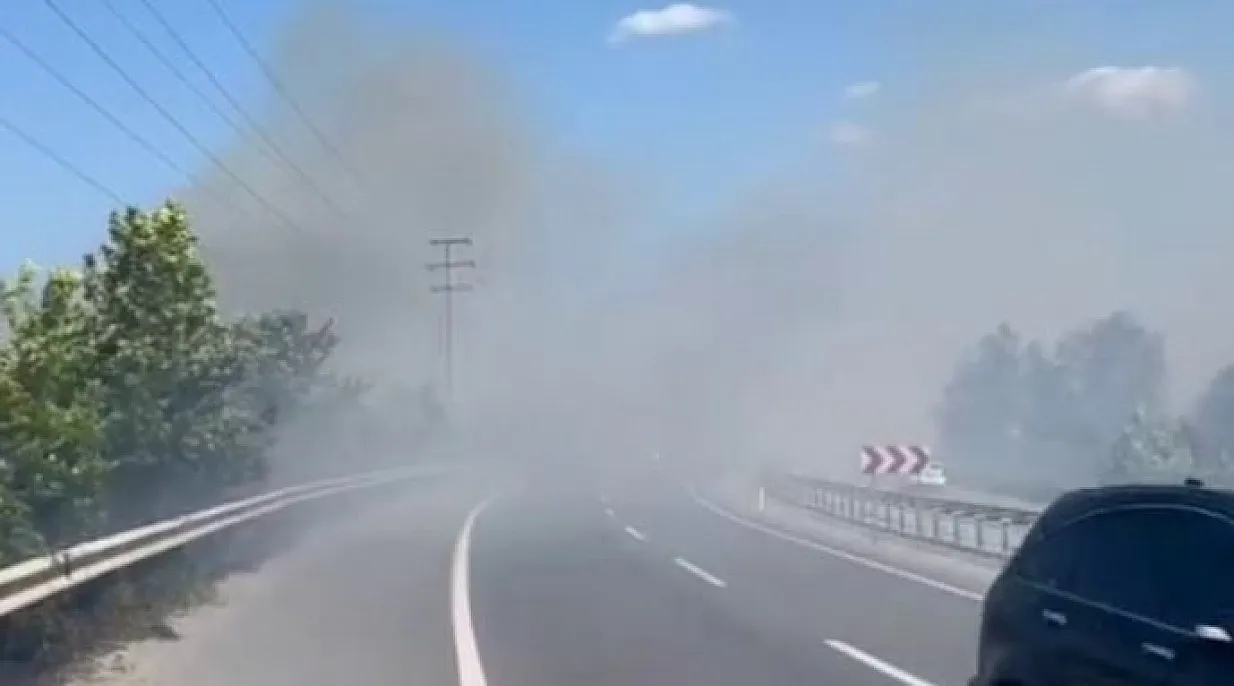 Otluk alanda çıkan yangın, kara yolunu kapladı. Yangın, itfaiye ekiplerinin müdahalesiyle söndürüldü.