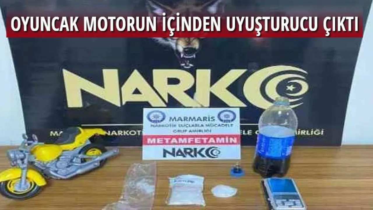 Edinilen bilgiye göre, Marmaris Narkotik Suçlarla Mücadele Grup Amirliği ekiplerince yapılan çalışmalar çerçevesinde düzenlenen operasyonda K.K. ve S.T. isimli şahıs birlikte yakalandı. Yapılan aramalarda S.T. isimli şahsın çocuğuna ait olan oyuncak motor içerisinde üç parça halinde 46,58 gram metamfetamin uyuşturucu madde ele geçirildi. Devam eden aramalarda, hassas terazi, metamfetamin ile karıştırılmış içecek ele geçirildi. Gözaltına alınan iki şahıstan K.K. çıkarıldığı mahkeme tarafından tutuklanırken, S.T. ise adli kontrol şartıyla serbest bırakıldı.