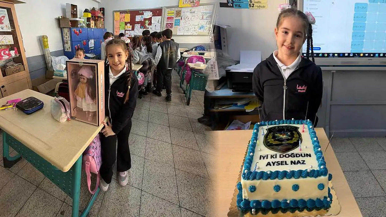 İlkokul ikinci sınıfa giden Aygün'ün sınıfına giden Özel Harekat polisleri, sınıfa pasta ile girerek küzük kıza hediyeler verdi. Duygusal anların yaşandığı kutlamada, minik Aysel Naz'ın mutluluğu yüzüne yansıdı.