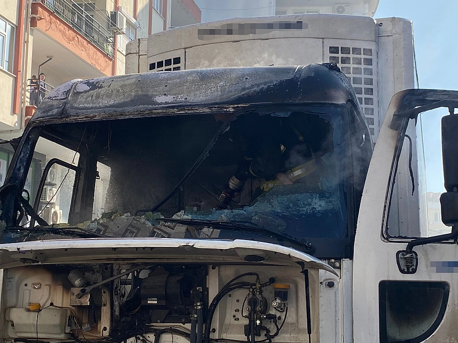 Antalya'nın Serik ilçesinde park halindeki bir kamyon, çıkan yangında kullanılamaz hale geldi.