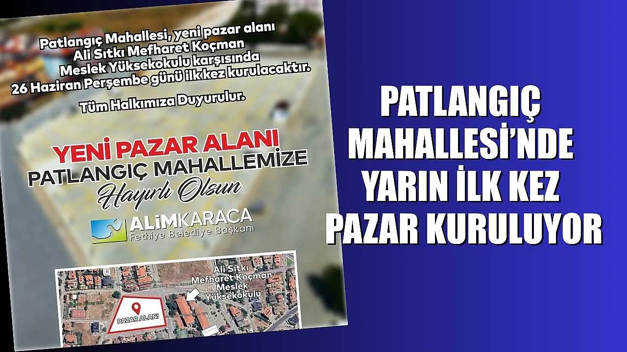 Fethiye'nin Patlangıç Mahallesi'nde, Ali Sıtkı Mefharet Koçman Meslek Yüksekokulu karşısında yeni bir pazar alanı hizmete giriyor. Fethiye Belediyesi tarafından hayata geçirilen proje kapsamında, pazar ilk kez 26 Haziran Perşembe günü kurulacak. Fethiye Belediye Başkanı Alim Karaca, yeni pazar yerinin mahalle halkına hayırlı olmasını dileyerek, bölgedeki alışveriş ihtiyacını karşılayacak önemli bir adım attıklarını belirtti.