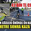 Trafik polislerinin gözlerinin önünde motosikletin önünü kaldıran ve 'dur' ihtarına uymayan motosiklet sürücüsü 200 metre ileride kaza yaptı. Kaza yapan motosikletli yaralanmasına rağmen olay yerinden kaçtı. Trafik polisi tarafından bağlanan motosiklete 42 bin 908 TL ceza uygulandı.
