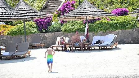 Bodrum'dan vaz geçmeyen Eski kaleci Rüştü Reçber ile eşi Işıl Reçber, sezonu cennet koyda bulunan evlerinin plajında açtı.