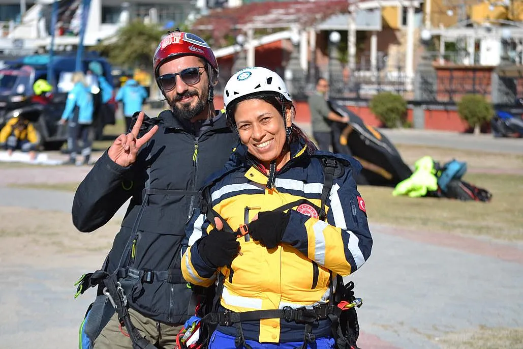 Muğla'nın Fethiye ilçesinde 'Acil Sağlık Hizmetleri Haftası'nı' acil sağlık merkezi çalışanları yamaç paraşütünde Türk bayrağı açarak kutladı.