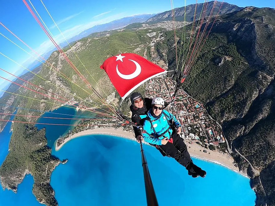 Muğla'nın Fethiye ilçesinde 'Acil Sağlık Hizmetleri Haftası'nı' acil sağlık merkezi çalışanları yamaç paraşütünde Türk bayrağı açarak kutladı.