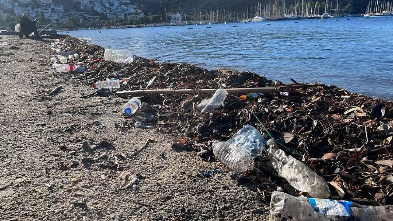 Muğla'nın Bodrum ilçesinde derelere atılan çöpler, sağanak yağmur sonrası plajlarda ve Bitez Barajı'nda birikti.