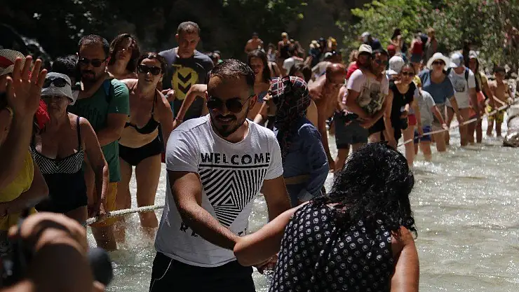 Antalya’nın Kaş ile Muğla’nın Seydikemer ilçesi sınırında yer alan Saklıkent Milli Parkı’na gelen turistler, 18 kilometrelik kanyonda, dik yamaçlara demir çubuklarla tutturulan 200 metrelik köprüyle kanyonun girişine ulaşıp sudan, halat yardımıyla geçiyor. Kanyona gelen yerli ve yabancı turistler, şelaleler ve dik yamaçlardan oluşan doğal parkuru aşmanın heyecanını yaşarken, dar ve yüksek kayalıklar arasında ilerleyerek, bazı noktalarda bellerine kadar ulaşan suyun içinden geçiyor. 18 kilometrelik kanyon içinde gezen turistler, dönüş yolunda çamur banyolarında keyifli dakikalar yaşıyor.