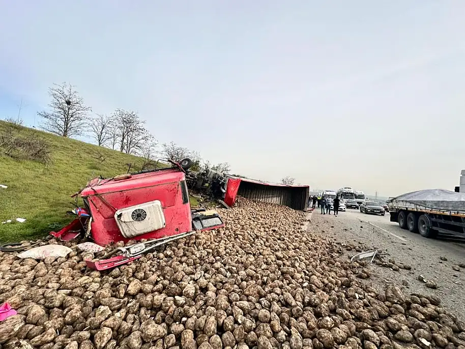 Şeker pancarı yüklü tır kontrolden çıkıp, önce hafif ticari araca ardından kamyonete çarptı. Savrulan araçlar refüje girerken, tır devrildi. 1'i ağır 5 kişinin yaralandığı olay yerine çok sayıda sağlık ve polis ekibi sevk edildi.