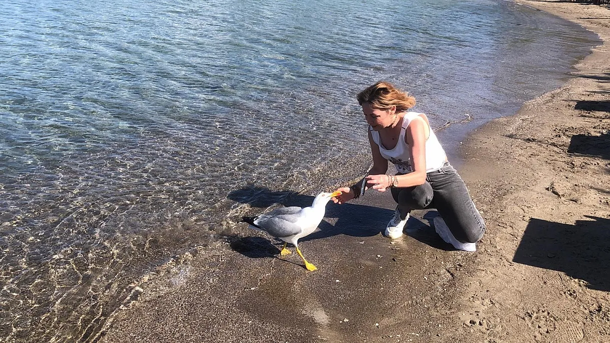 Muğla'nın Datça ilçesinde 4 yıldan bu yana balıkçıların peşinden ayrılmayan, çevredeki esnaf ve vatandaşlar tarafından beslenen martı, Kumluk Plajı'nın maskotu oldu.