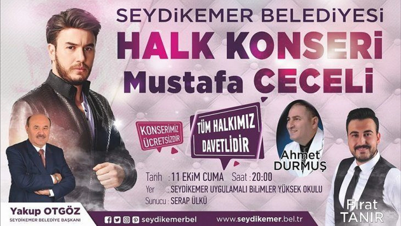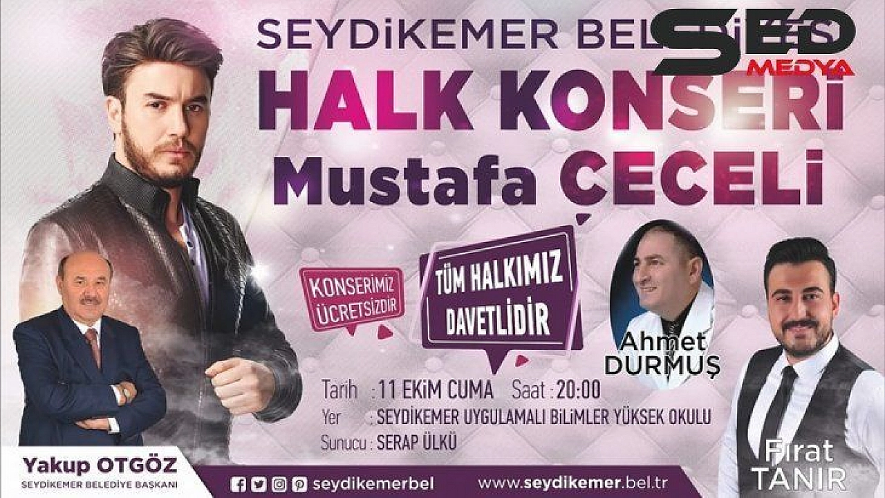 Seydikemer Belediyesi kültür ve sanat etkinlikleri kapsamında halk konseri düzenliyor. 11 Ekim Cuma günü gerçekleşecek organizasyonda Türk müziğinin sevilen isimlerinden Mustafa Ceceli'nin sahne alacağı belirtildi.