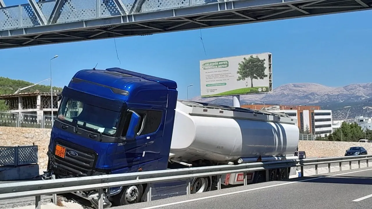 Muğla'da Menteşe Devrant rampasında seyir halinde olan akaryakıt yüklü TIR'ın şoförü uyuyunca karayolunun ortasında çelik bariyerlere çarparak durdu.