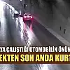 Amasya'da motosiklet sürücüsü tünelde sollamaya çalıştığı otomobilin önüne düştü. Motosikletlinin, ezilmekten son anda kurtulduğu o anlar kameraya yansıdı.