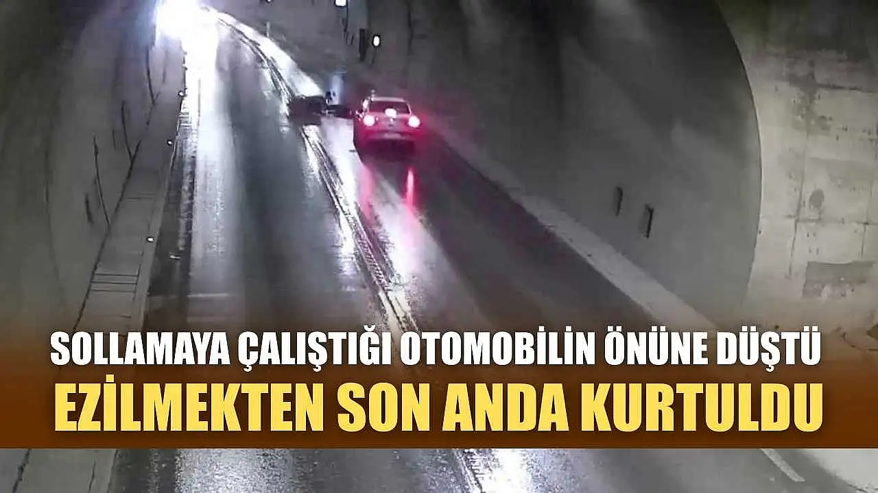 Ferhat Tüneli’nde önündeki otomobili sollamak isteyen motosikletli, kaygan zeminde kontrolden çıkarak devrildi. Motosikletli, otomobil sürücüsünün dikkati sayesinde ezilmekten kurtuldu. Bir süre sonra kendi imkanlarıyla ayağa kalkan motosiklet sürücüsü, motosikletini yerden kaldırarak yoluna devam etti. Kaza anı güvenlik kamerasına yansıdı.