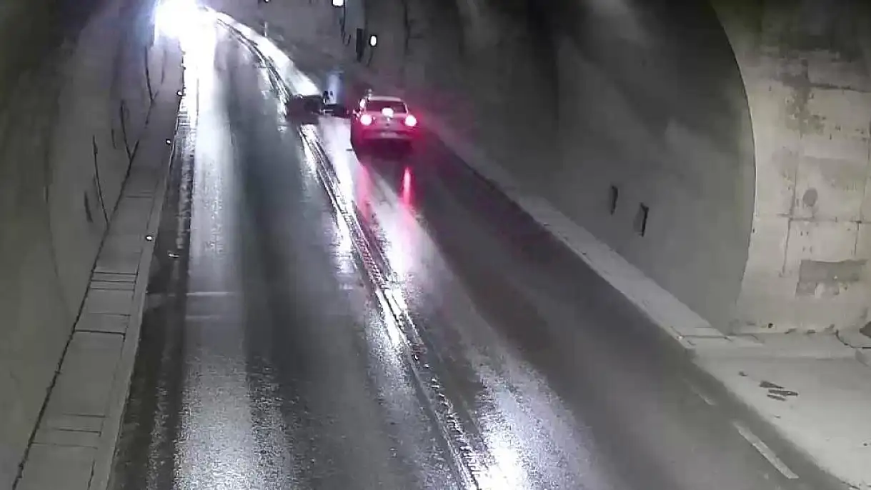 Amasya'da motosiklet sürücüsü tünelde sollamaya çalıştığı otomobilin önüne düştü. Motosikletlinin, ezilmekten son anda kurtulduğu o anlar kameraya yansıdı.