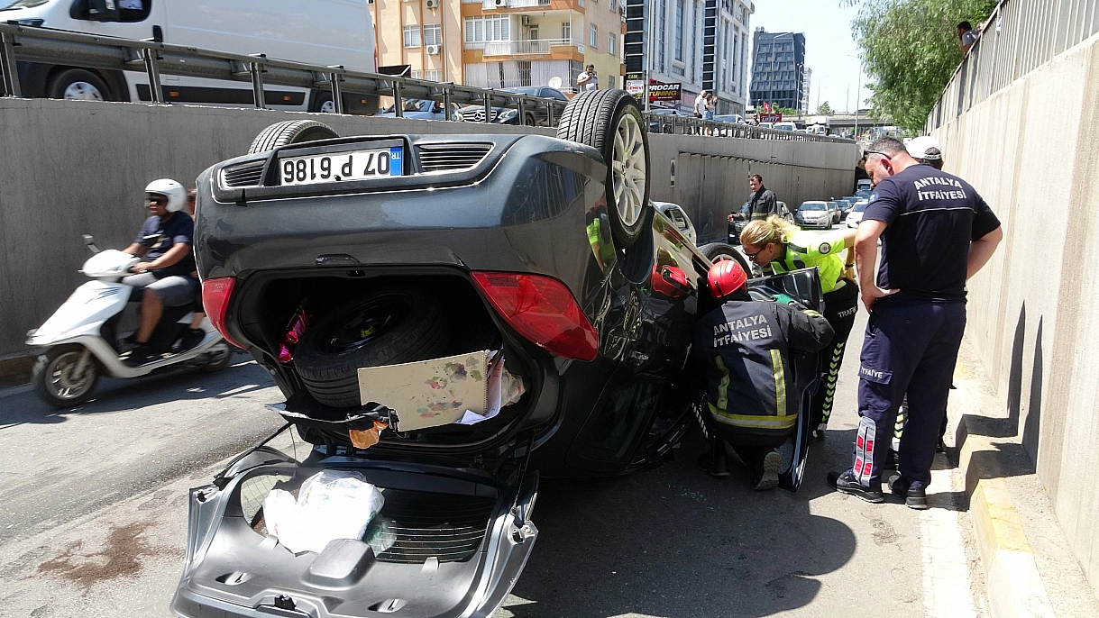 Alt geçit çıkışında sürücüsünün direksiyon hakimiyetini kaybeden araç takla attı. Sürücü ters dönen araçtan burnu bile kanamadan çıkarıldı.