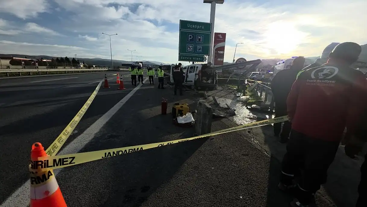 TEM Otoyolu'nun Düzce geçişinde bariyerlere ok gibi saplanan hafif ticari araçtaki 2 kişi olay yerinde hayatını kaybetti.