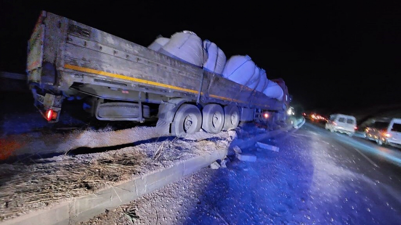 Tır refüje takıldı, faciadan dönüldü