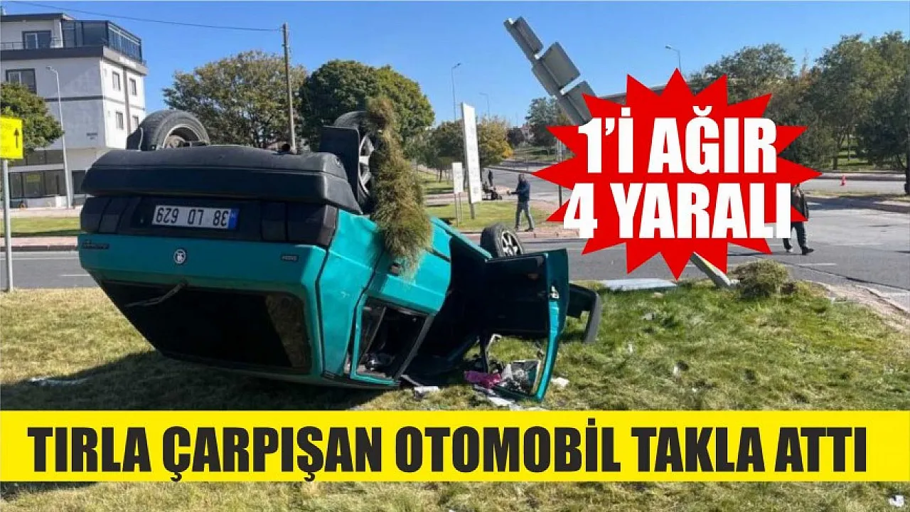 Kayseri’nin Kocasinan ilçesinde tırla çarpışan otomobilin takla atarak ters döndüğü kazada, otomobilde bulunan 4 kişi yaralandı. Edinilen bilgiye göre, ilçeye bağlı Erkilet Mahallesi Erkilet Bulvarı’nda meydana gelen kazada, İ.P. idaresindeki 38 AT 197 plakalı tır ile H.K.'nin sürücüsü olduğu 38 LD 629 plakalı otomobil kavşakta kaza yaptı.