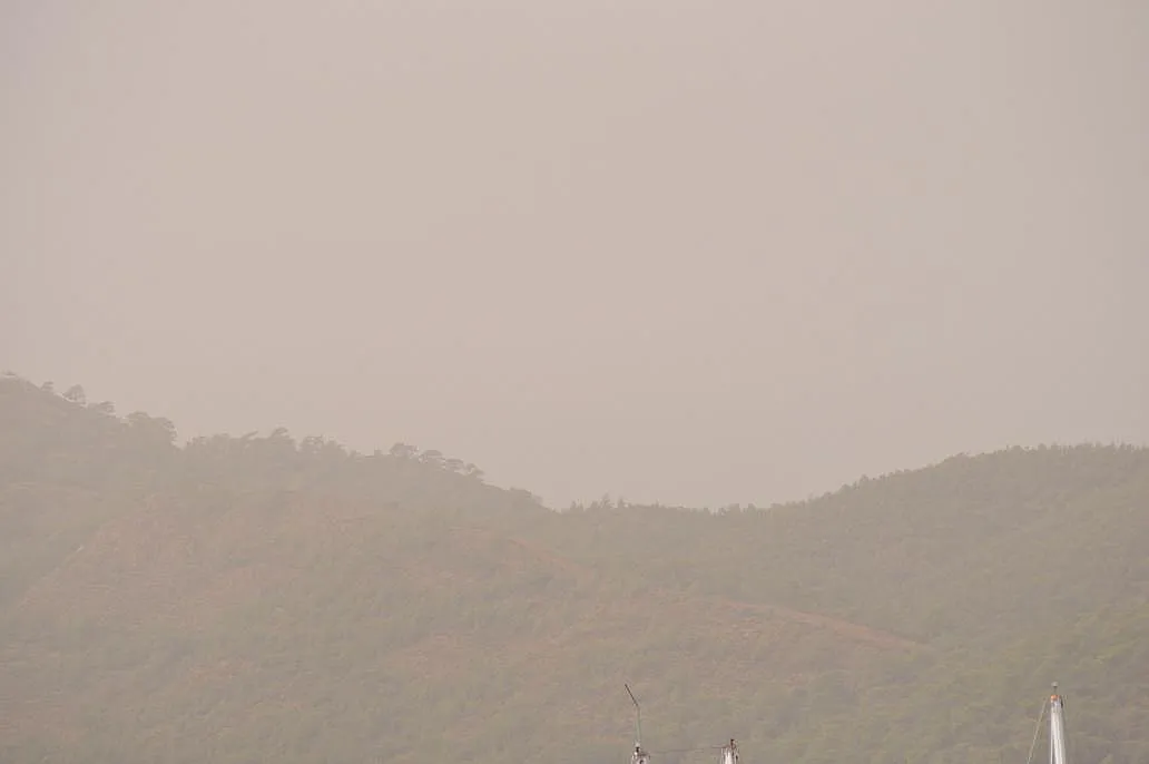 Fethiye'de etkisini ilerleyen saatlerde göstermesi beklenen yağmurla beraber gökyüzünü toz bulutu kapladı.