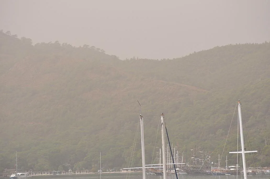 Fethiye'de etkisini ilerleyen saatlerde göstermesi beklenen yağmurla beraber gökyüzünü toz bulutu kapladı.
