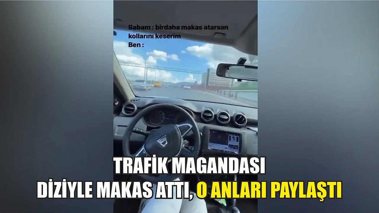 İzmir'in Konak ilçesinde otomobil ile seyir halinde olan bir sürücü, otomobilini diziyle yönlendirerek kullandı. Trafikteki vatandaşların canını riske atan şahıs diziyle makas atarak ilerlerken o anları da video kaydına alıp sosyal medya hesabından paylaştı. Trafiği tehlikeye atan sürücü o anları, "Babam: 'Bir daha makas atarsan kollarını keserim', Ben:" sözleriyle paylaştı.