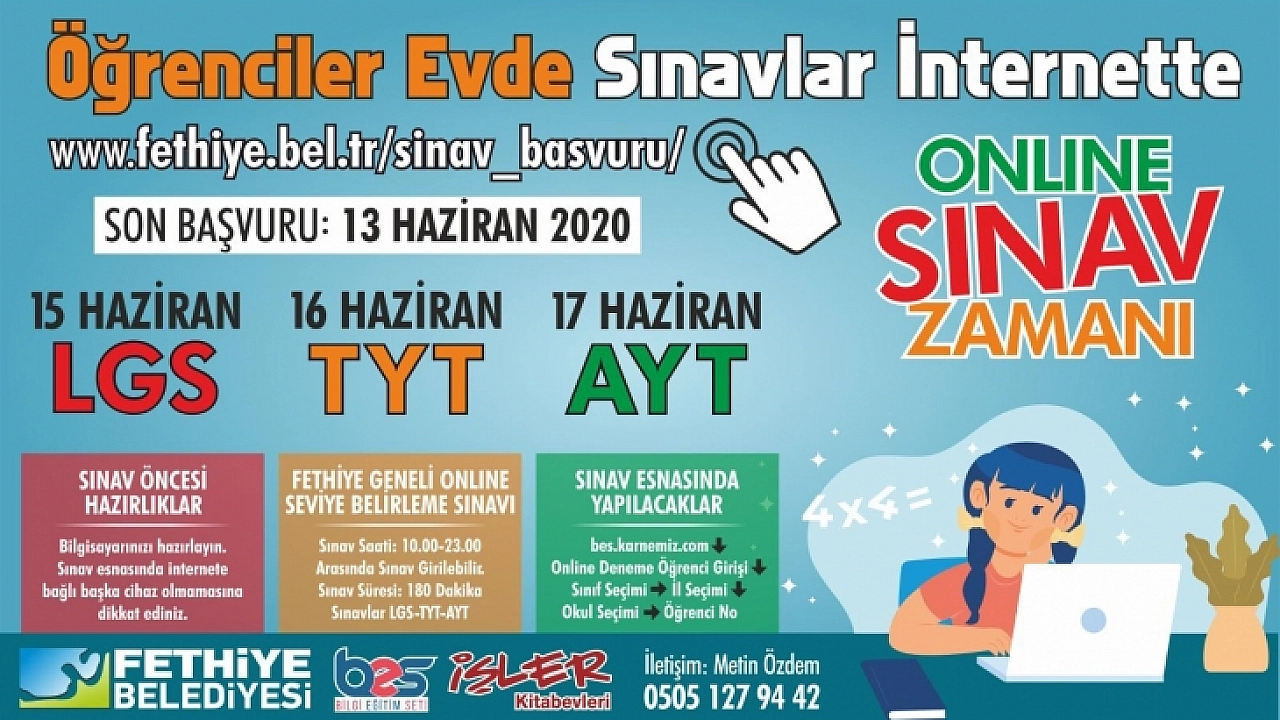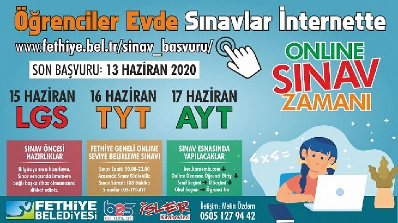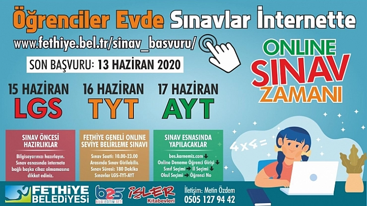 Fethiye Belediyesi salgın günlerinde sınavlara hazırlanan öğrencilere destek olmak için Ücretsiz Online Deneme Sınavları projesini başlattı. Deneme sınavlarına katılmak isteyenler Fethiye Belediyesi resmi internet sitesi (www.fethiye.bel.tr/sinav_basvuru) adresinden başvuru yapabilecek.