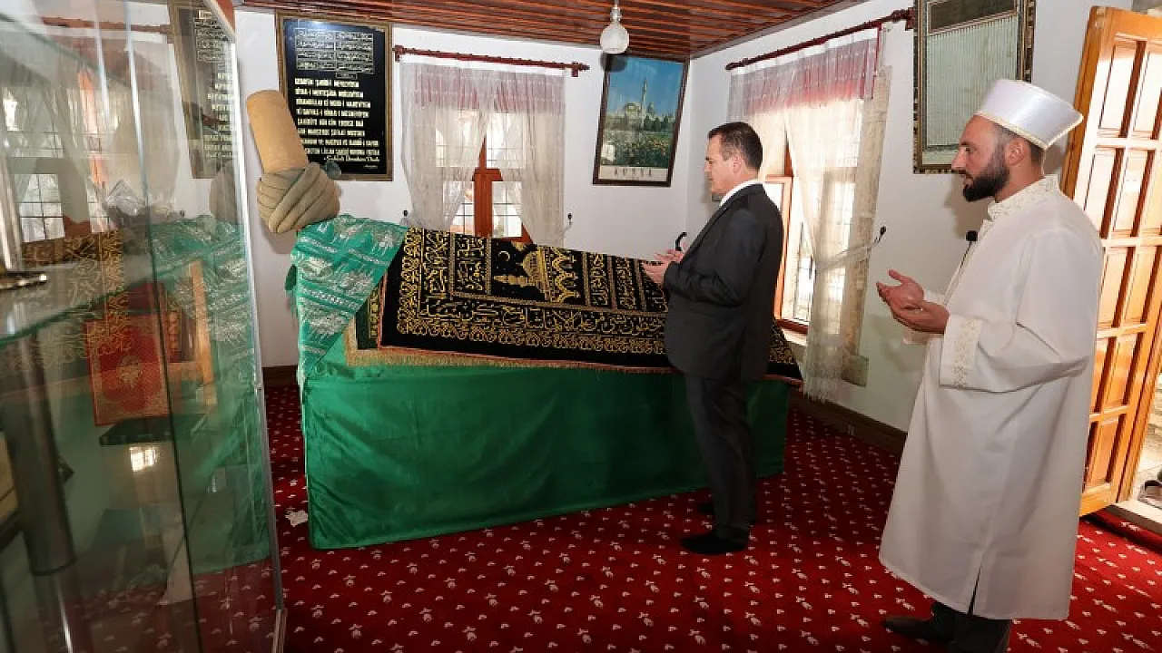 Türkiye’de sadece üç yerde Mevlevihane ve Cami özelliğiyle asırlara meydan okuyan Şahidi Camisinde incelemelerde bulunan Vali Akbıyık, Şahidi Hazretleri'nin, dedesi İbrahim ve babası Hüdai'nin türbe halindeki kabirlerini ziyaret etti.