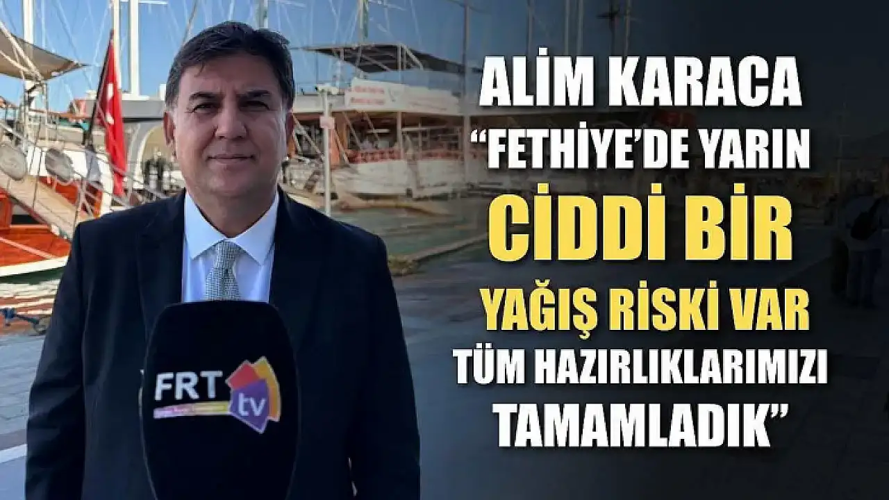 Fethiye Belediye Başkanı Alim Karaca, yarın için Meteoroloji'den gelen yoğun yağış uyarısına dikkat çekerek, tüm ekiplerin hazır olduğunu söyledi. Altyapı çalışmalarının sürdüğünü belirten Karaca, vatandaşlardan çarşı merkezi ve riskli bölgelere araçla gelmemelerini istedi.