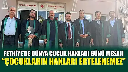 Muğla Barosu Fethiye Temsilcisi Av. Ufuk Kaya, 20 Kasım Dünya Çocuk Hakları Günü kapsamında Fethiye Adliyesi önünde yaptığı açıklamada, çocukların korunmasının devletin ertelenemez yükümlülüğü olduğunu söyledi.