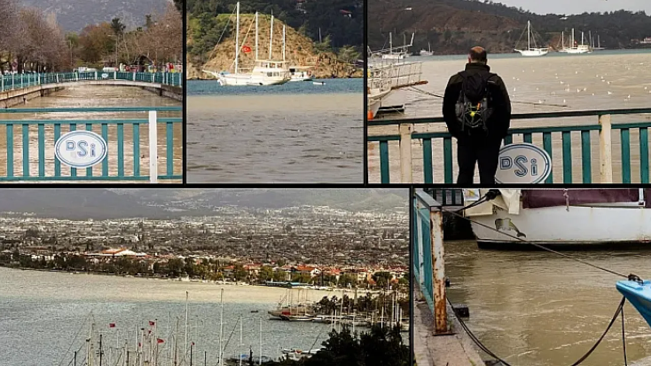 Muğla'nın Fethiye ilçesinde etkili olan sağanak nedeniyle dağlardan akan çamurlu su, Fethiye Körfezinin renginin değişmesine yol açtı.