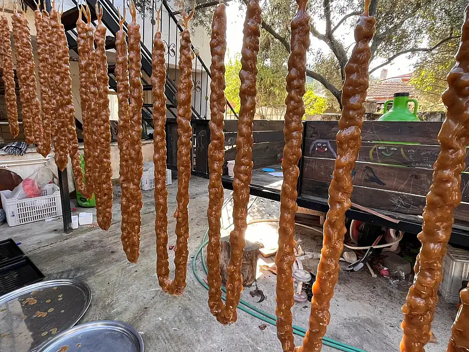 Muğla'nın Yatağan ilçesi Şahinler Mahallesi'nden Servet Çıldır, tamamen doğal ürünlerle yaptığı cevizli sucukla hem damaklara hem de sağlığa hitap ediyor.