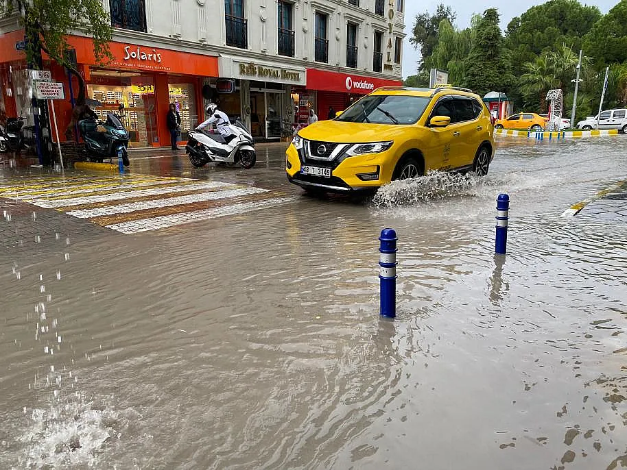 Fethiye'de başlayan şiddetli yağış nedeniyle yollar adeta göle döndü. Vatandaşlar yürümekte zorlanırken araç sürücüleri ise trafikte ilerlemekte güçlük çekti.