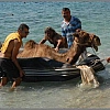 Fethiye'de ulaşımın sadece deniz yolu ile sağlandığı Kelebekler Vadi'sinde mahsur kalan Fatoş isimli bir deve zodyak botla karaya çıkarıldı.